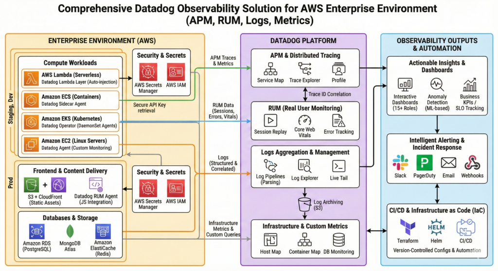 We led the full lifecycle design, implementation, and deployment of a comprehensive observability platform using Datadog across a complex, distributed enterprise-grade environment spanning AWS EC2, ECS, EKS, and serverless Lambda functions. The goal was to unify application performance monitoring (APM), real user monitoring (RUM), logs, infrastructure metrics, custom alerts, and dashboards across multiple environments (dev, staging, production) ensuring end-to-end visibility into system health and user experience.